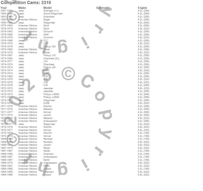 Ambassador, American, AMX, Cherokee (SJ), CJ5, CJ6, CJ7, Classic, Concord, DJ5B, DJ5C, Eagle, Grand Wagoneer, Gremlin, Hornet, J-2500, J-2600, J10, J20, Javelin