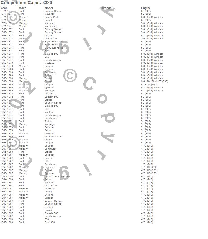 Bronco, Caliente, Club Cargo, Colony Park, Comet, Commuter, Cougar, Country Sedan, Country Squire, Custom, Custom 500, Cyclone, E-100 Econoline, E-200 Econoline, E-300 Econoline, F-100, Fairlane, Falcon, Falcon Sedan Delivery, Ford 300