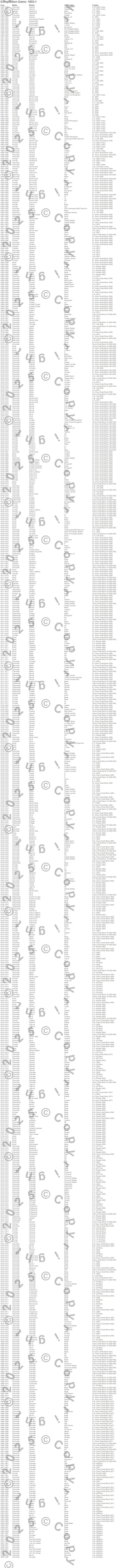 98, Apollo, Bel Air, Biscayne, Bonneville, Brookwood, Brougham, Camaro, Caprice, Catalina, Centurion, Century, Chevelle, Chevy II, Commercial Chassis, Corvette, Custom Cruiser, Cutlass, Cutlass Calais, Cutlass Cruiser
