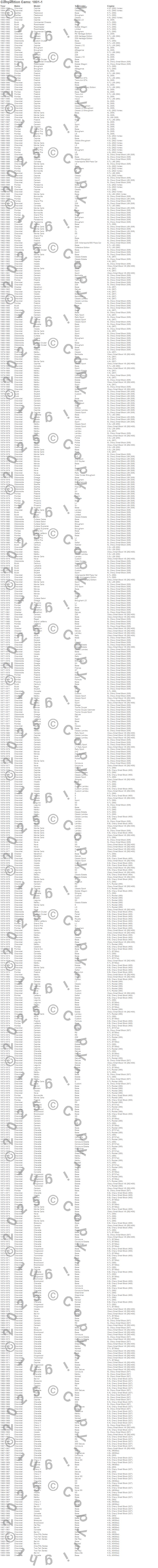 Bel Air, Biscayne, Bonneville, Brookwood, Brougham, Camaro, Caprice, Catalina, Century, Chevelle, Chevy II, Commercial Chassis, Corvette, Custom Cruiser, Cutlass, Cutlass Calais, Cutlass Cruiser, Cutlass Salon, Cutlass Supreme, Del Ray