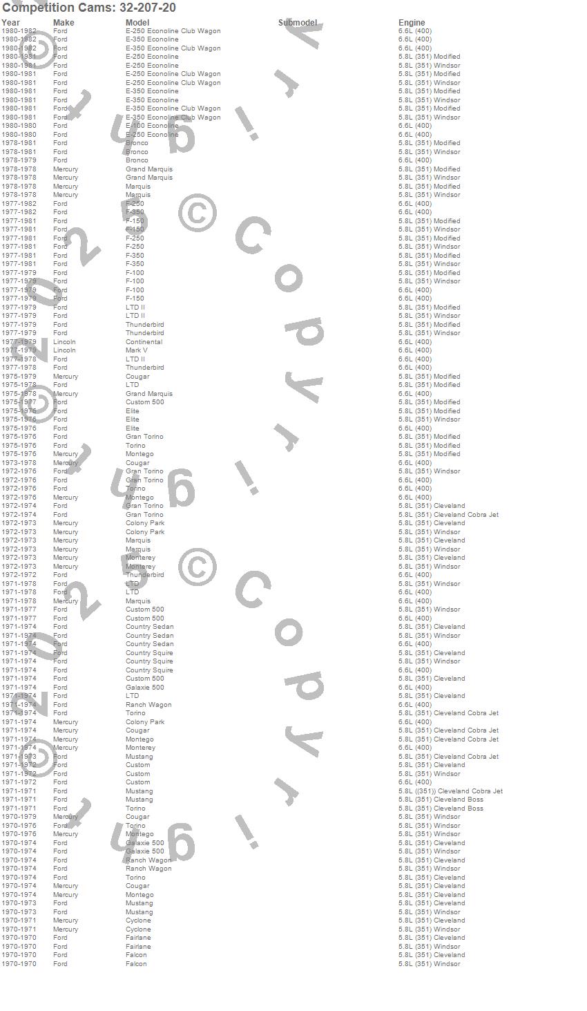 Bronco, Colony Park, Continental, Cougar, Country Sedan, Country Squire, Custom, Custom 500, Cyclone, E-100 Econoline, E-250 Econoline, E-250 Econoline Club Wagon, E-350 Econoline, E-350 Econoline Club Wagon, Elite, F-100, F-150, F-250, F-350, Fairlane