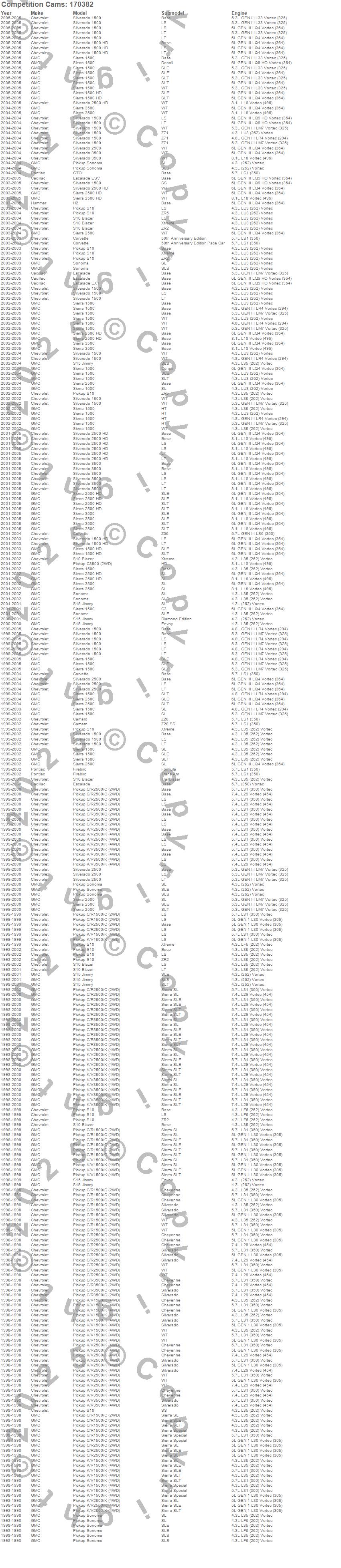 C1500 Pickup, C2500 Pickup, C3500 Pickup, Camaro, Corvette, Escalade, Escalade ESV, Escalade EXT, Firebird, GTO, H2, K1500 Pickup, K2500 Pickup, K3500 Pickup, S10 Blazer, S10 Blazer (Canadian), S10 Pickup, S15 Jimmy, Sierra 1500, Sierra 1500 HD