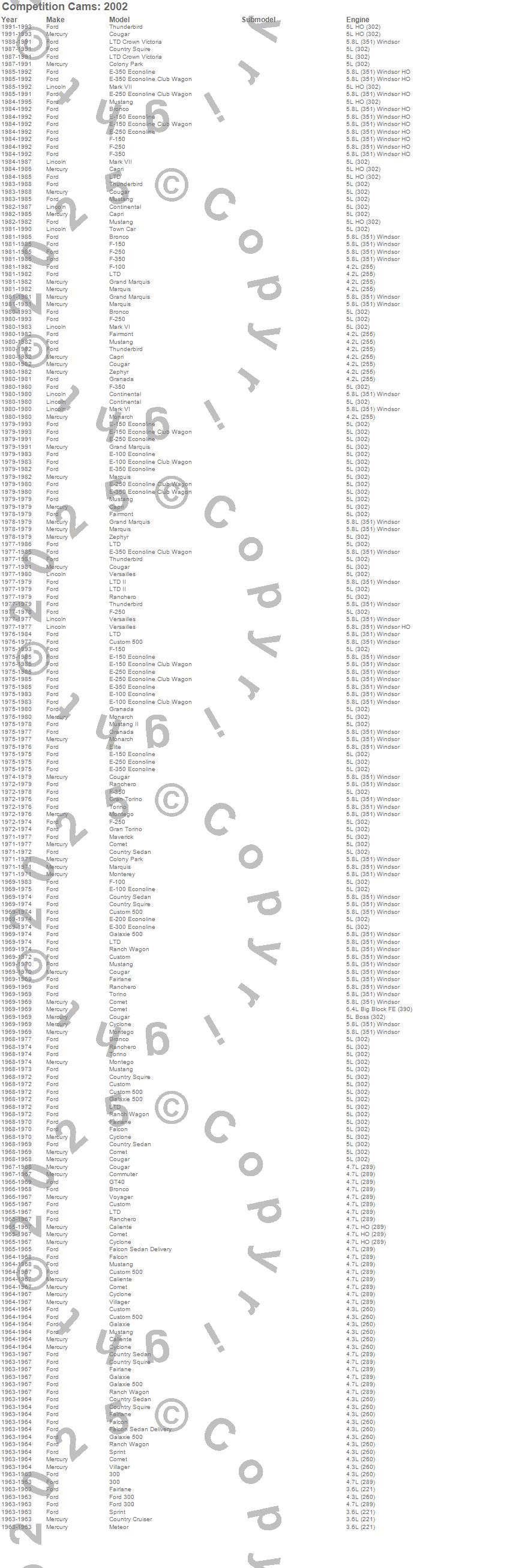 Bronco, Caliente, Capri, Colony Park, Comet, Commuter, Continental, Cougar, Country Cruiser, Country Sedan, Country Squire, Custom, Custom 500, Cyclone, E-100 Econoline, E-100 Econoline Club Wagon, E-150 Econoline, E-150 Econoline Club Wagon, E-200 Econoline, E-250 Econoline