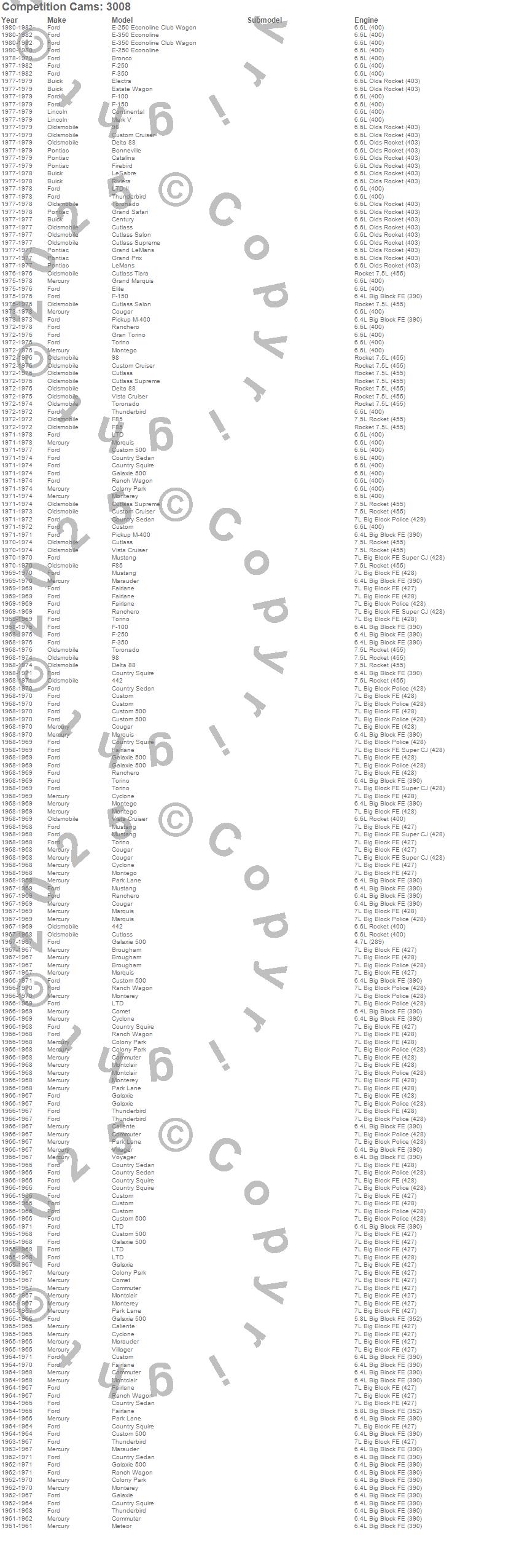 442, 98, Bonneville, Breezeway, Bronco, Brougham, Caliente, Catalina, Century, Club Cargo, Colony Park, Comet, Commuter, Continental, Cougar, Country Sedan, Country Squire, Custom, Custom 500, Custom Cruiser