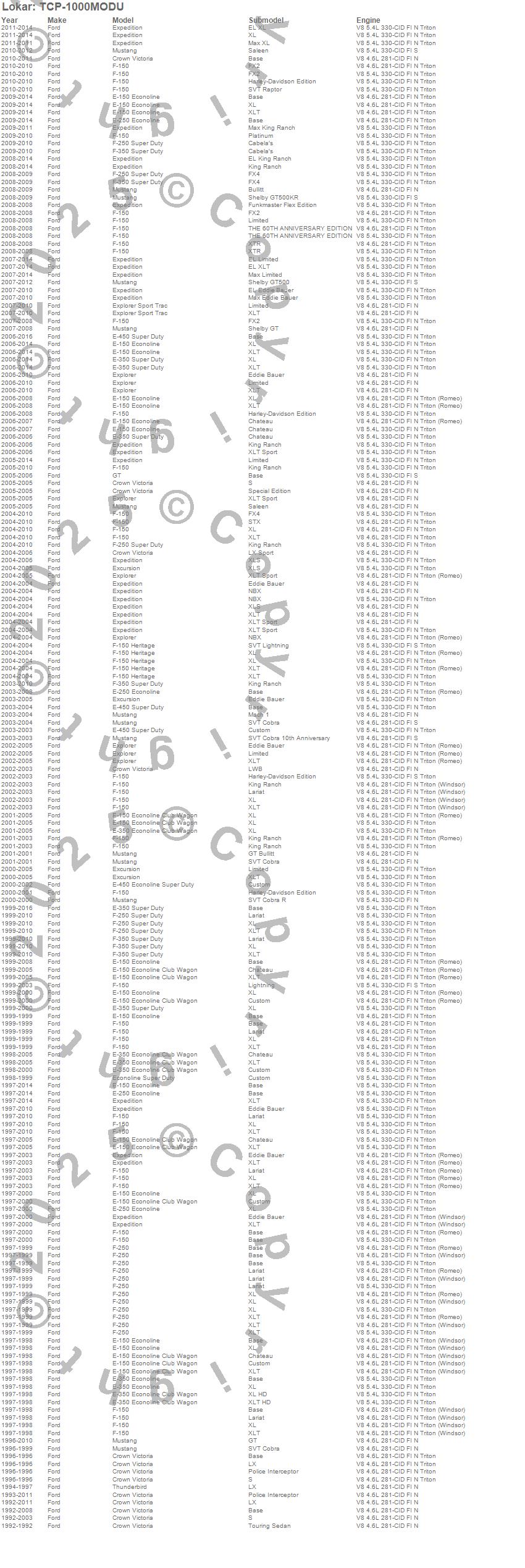 Crown Victoria, E-150 Econoline, E-150 Econoline Club Wagon, E-250 Econoline, E-350 Econoline, E-350 Econoline Club Wagon, E-350 Super Duty, E-450 Econoline Super Duty, E-450 Super Duty, Econoline Super Duty, Excursion, Expedition, Explorer, Explorer Sport Trac, F-150, F-150 Heritage, F-250, F-250 Super Duty, F-350 Super Duty, GT