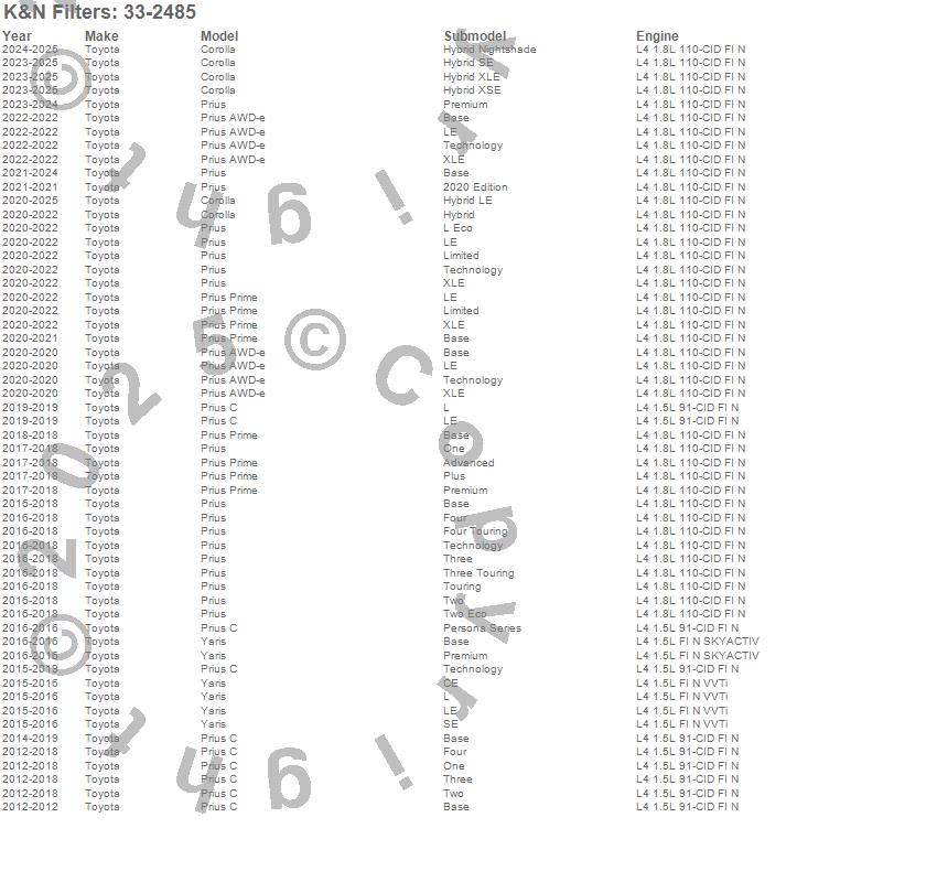 Corolla, Prius, Prius AWD-e, Prius C, Prius Prime, Yaris, Toyota, 2025, 2024, 2023, 2022, 2021, 2020, 2019, 2018, 2017, 2016, 2015, 2014, 2013