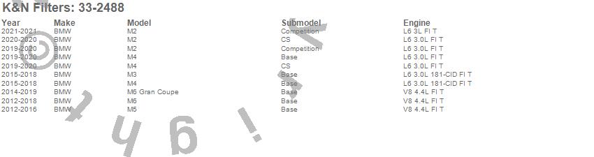 Below is an abbreviated list of applications for the Air Filter.