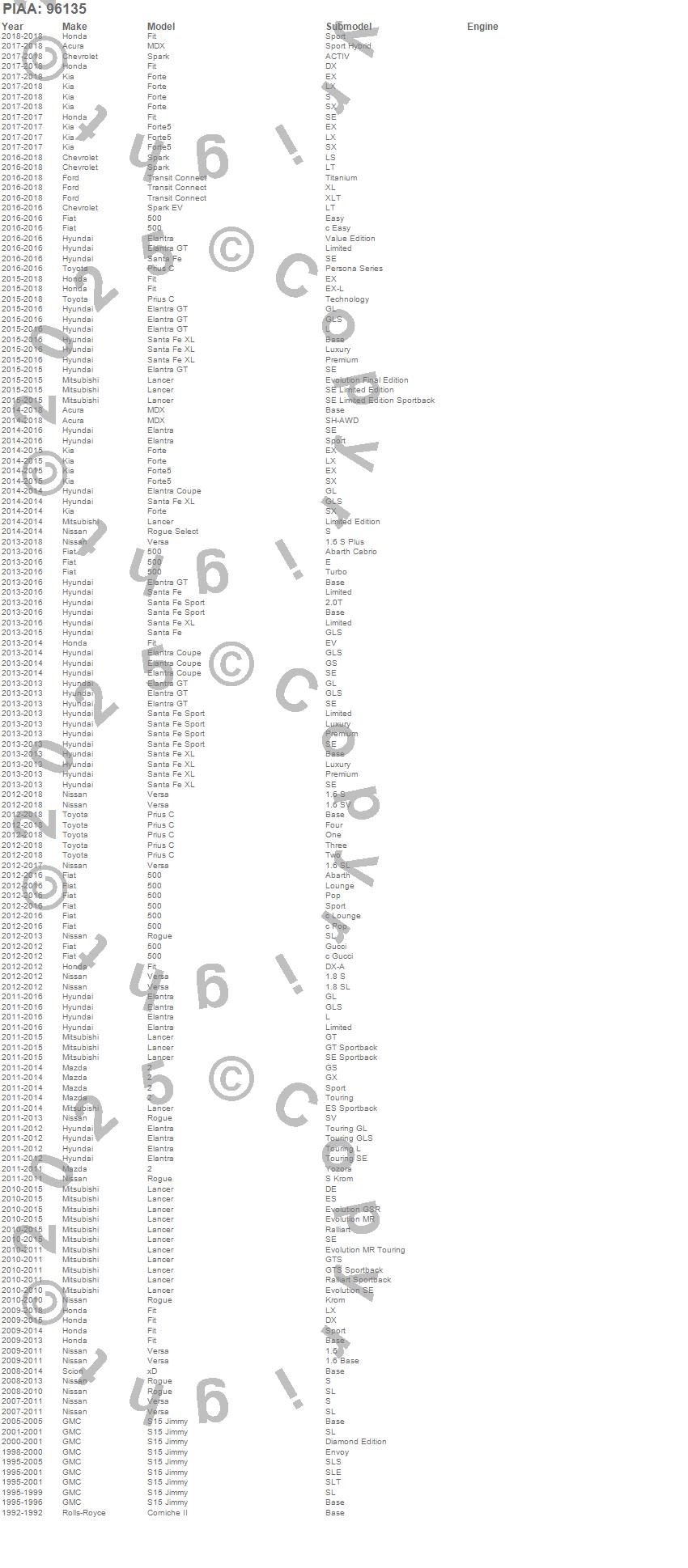 2, 500, Corniche II, Elantra, Elantra Coupe, Elantra GT, Fit, Forte, Forte5, Lancer, MDX, Prius C, Rogue, Rogue Select, S15 Jimmy, Santa Fe, Santa Fe Sport, Santa Fe XL, Spark, Spark EV
