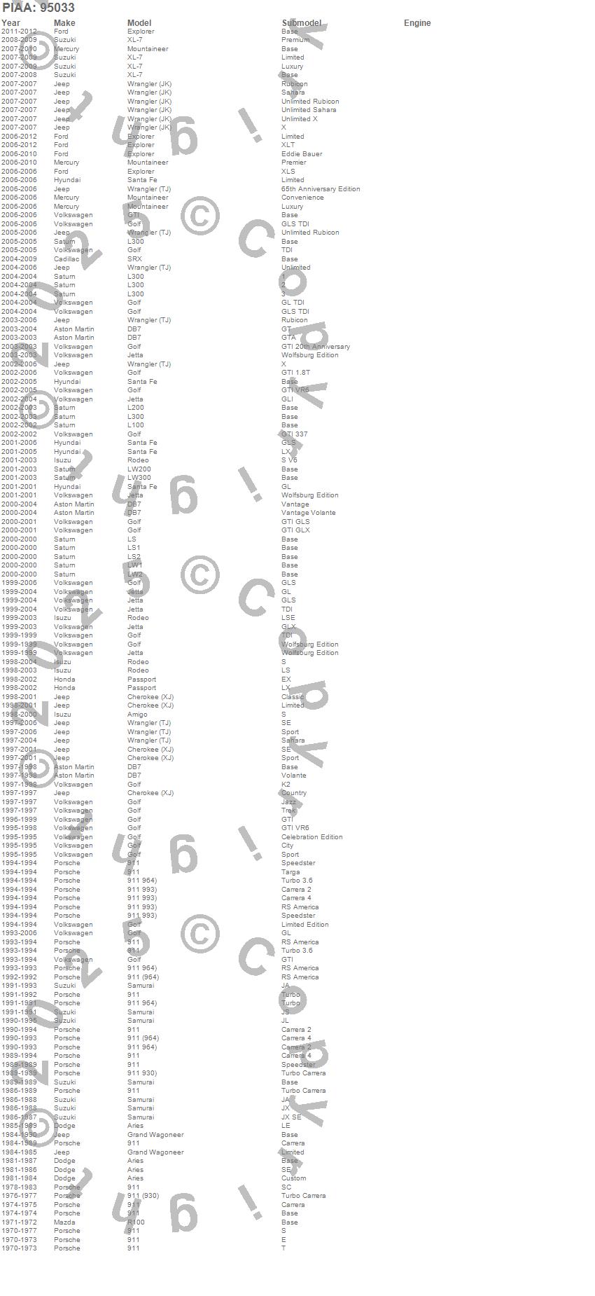 911, Amigo, Aries, Cherokee (XJ), DB7, Explorer, Golf, Grand Wagoneer, GTI, Jetta, L100, L200, L300, LS, LS1, LS2, LW1, LW2, LW200, LW300
