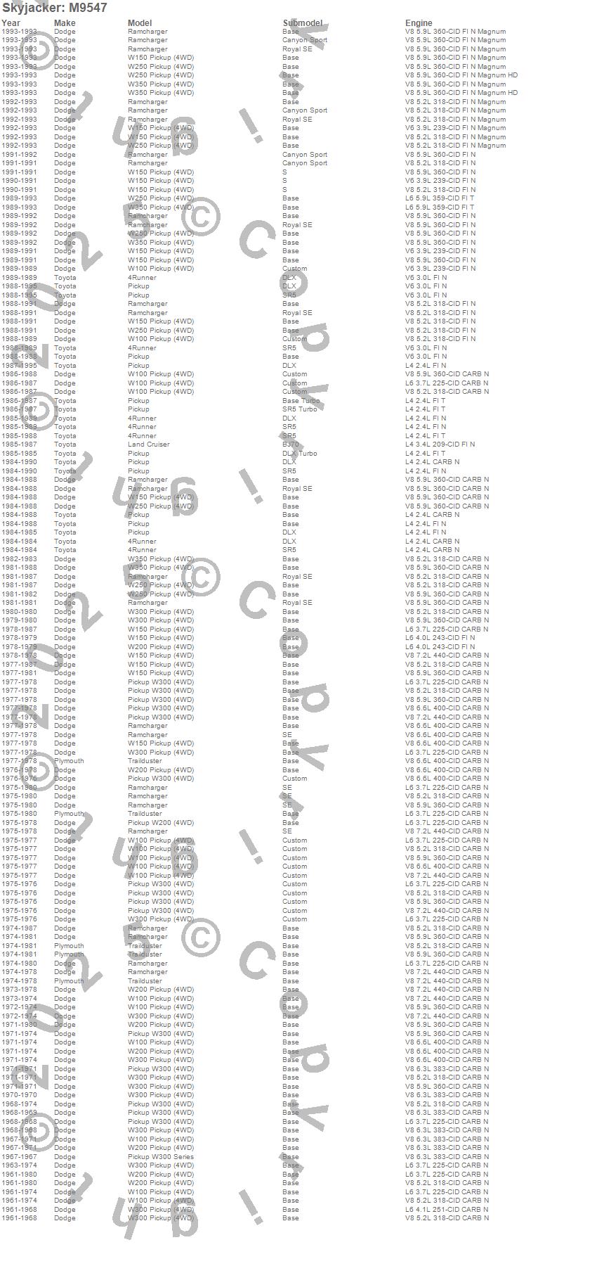 4Runner, Land Cruiser, Pickup, Ramcharger, Trailduster, W100 Pickup, W150 Pickup, W200 Pickup, W250 Pickup, W300 Pickup, W300 Series, W350 Pickup, Dodge, Plymouth, Toyota, 1995, 1994, 1993, 1992, 1991