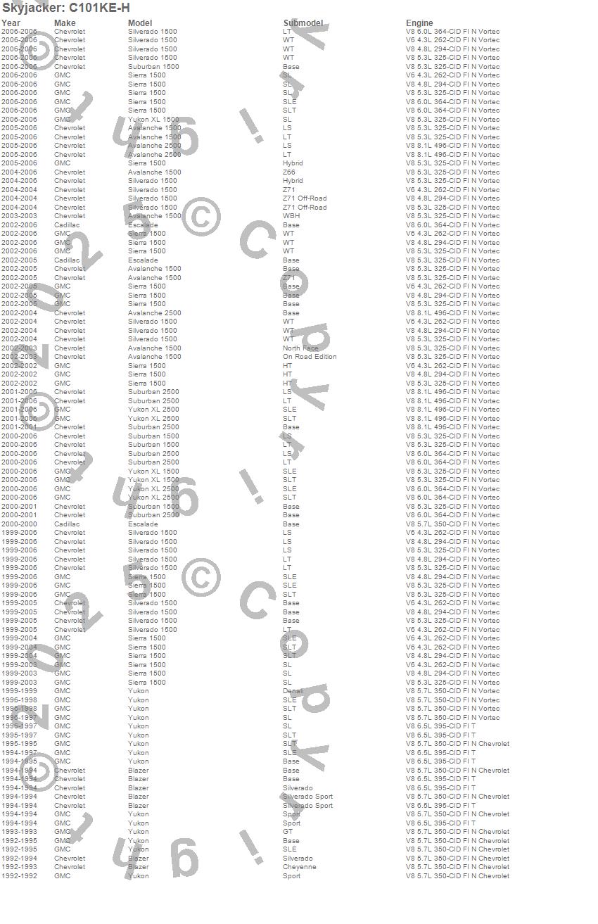Avalanche 1500, Avalanche 2500, Blazer, Escalade, Sierra 1500, Silverado 1500, Suburban 1500, Suburban 2500, Yukon, Yukon XL 1500, Yukon XL 2500, Cadillac, Chevrolet, GMC, 2006, 2005, 2004, 2003, 2002, 2001