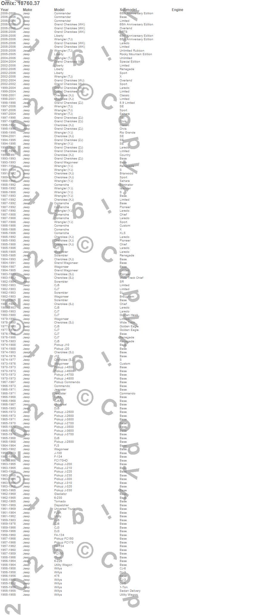 475, 6-226, 6-230, Cherokee (SJ), Cherokee (XJ), CJ3, CJ5, CJ5A, CJ6, CJ6A, CJ7, Comanche, Commander, Commando, Dispatcher, DJ3, DJ5, DJ6, F-134, F4