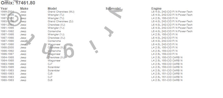 Cherokee (XJ), CJ5, CJ7, Comanche, DJ5, Grand Cherokee (WJ), Grand Cherokee (ZJ), Scrambler, Wagoneer, Wrangler (LJ), Wrangler (TJ), Wrangler (YJ), Jeep, 2006, 2005, 2004, 2003, 2002, 2001, 2000