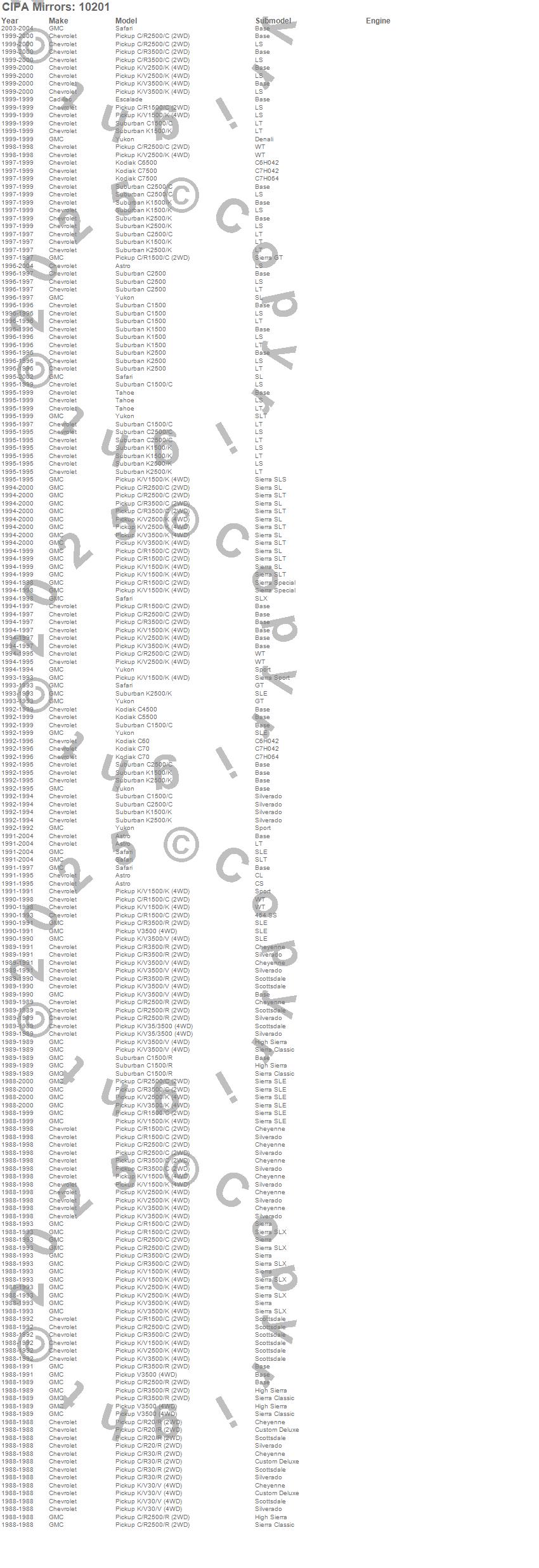 Astro, C1500 Pickup, C1500 Suburban, C2500 Pickup, C2500 Suburban, C3500 Pickup, C4500 Kodiak, C5500 Kodiak, C60 Kodiak, C6500 Kodiak, C70 Kodiak, C7500 Kodiak, Escalade, K1500, K1500 Pickup, K1500 Suburban, K2500 Pickup, K2500 Suburban, K3500 Pickup, R20 Pickup