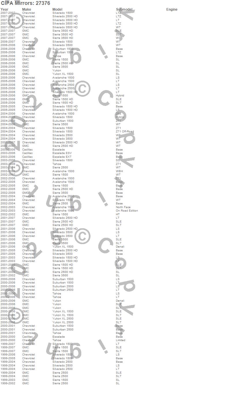 Avalanche 1500, Avalanche 2500, Escalade, Escalade ESV, Escalade EXT, Sierra 1500, Sierra 1500 HD, Sierra 2500, Sierra 2500 HD, Sierra 3500, Sierra 3500 HD, Silverado 1500, Silverado 1500 HD, Silverado 2500, Silverado 2500 HD, Silverado 3500, Silverado 3500 HD, Suburban 1500, Suburban 2500, Tahoe