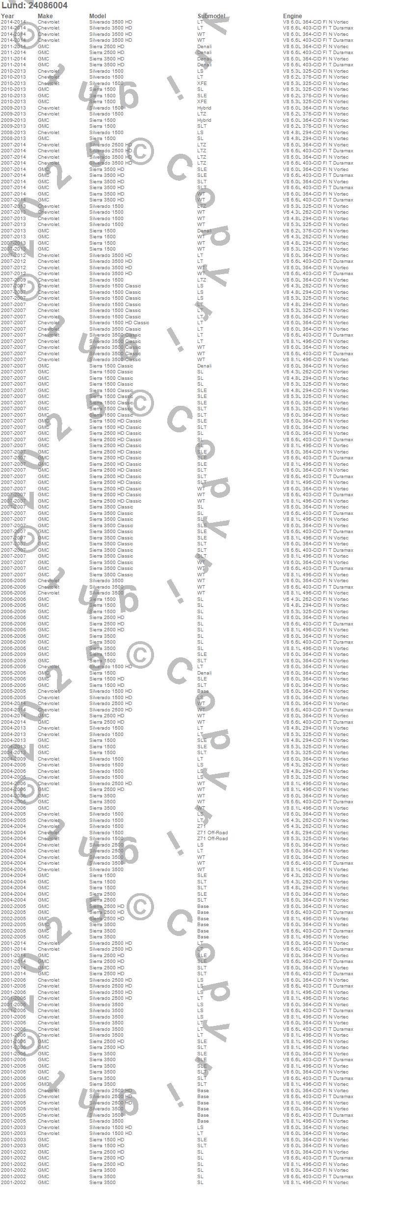 Sierra 1500, Sierra 1500 Classic, Sierra 1500 HD, Sierra 1500 HD Classic, Sierra 2500, Sierra 2500 HD, Sierra 2500 HD Classic, Sierra 3500, Sierra 3500 Classic, Sierra 3500 HD, Silverado 1500, Silverado 1500 Classic, Silverado 1500 HD, Silverado 1500 HD Classic, Silverado 2500, Silverado 2500 HD, Silverado 3500, Silverado 3500 Classic, Silverado 3500 HD, Chevrolet