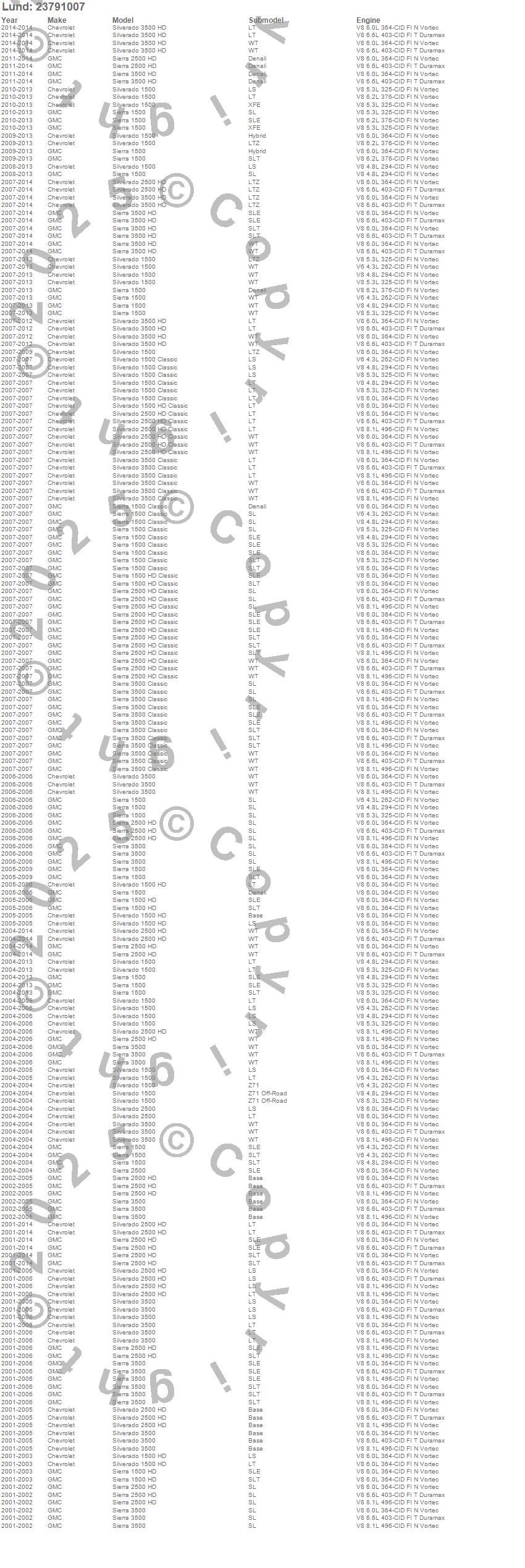 Sierra 1500, Sierra 1500 Classic, Sierra 1500 HD, Sierra 1500 HD Classic, Sierra 2500, Sierra 2500 HD, Sierra 2500 HD Classic, Sierra 3500, Sierra 3500 Classic, Sierra 3500 HD, Silverado 1500, Silverado 1500 Classic, Silverado 1500 HD, Silverado 1500 HD Classic, Silverado 2500, Silverado 2500 HD, Silverado 2500 HD Classic, Silverado 3500, Silverado 3500 Classic, Silverado 3500 HD