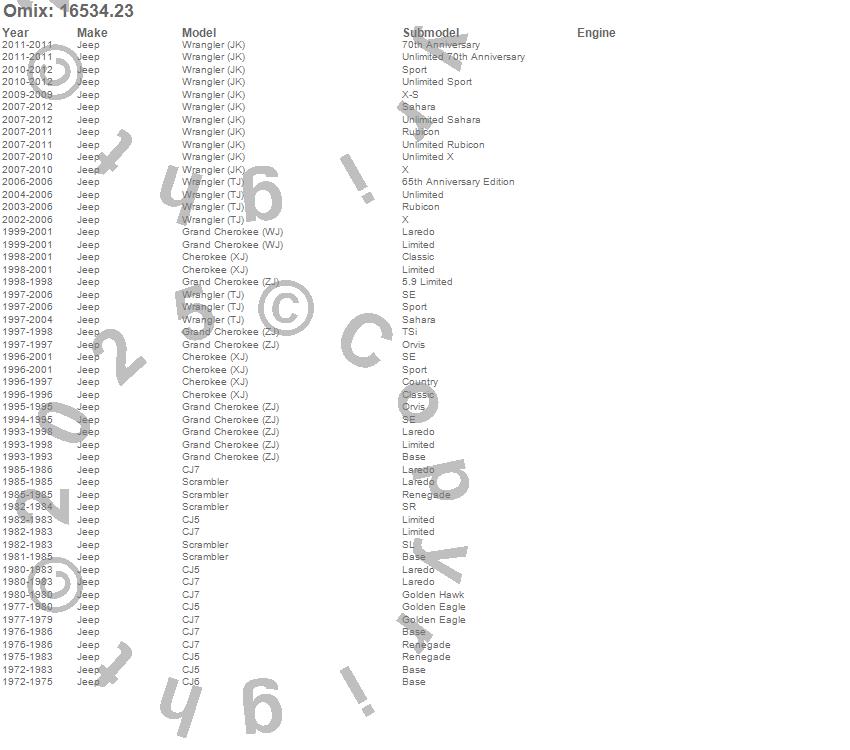 Cherokee (XJ), CJ5, CJ6, CJ7, Grand Cherokee (WJ), Grand Cherokee (ZJ), Scrambler, Wrangler (JK), Wrangler (LJ), Wrangler (TJ), Jeep, 2012, 2011, 2010, 2009, 2008, 2007, 2006, 2005, 2004
