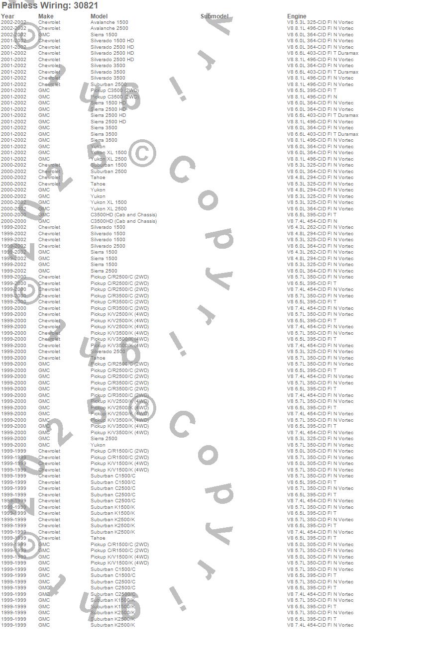 Avalanche 1500, Avalanche 2500, C1500 Pickup, C1500 Suburban, C2500 Pickup, C2500 Suburban, C3500 Pickup, C3500HD, K1500 Pickup, K1500 Suburban, K2500 Pickup, K2500 Suburban, K3500 Pickup, Sierra 1500, Sierra 1500 HD, Sierra 2500, Sierra 2500 HD, Sierra 3500, Silverado 1500, Silverado 1500 HD
