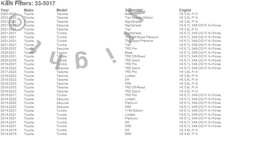 Below is an abbreviated list of applications for the Air Filter.