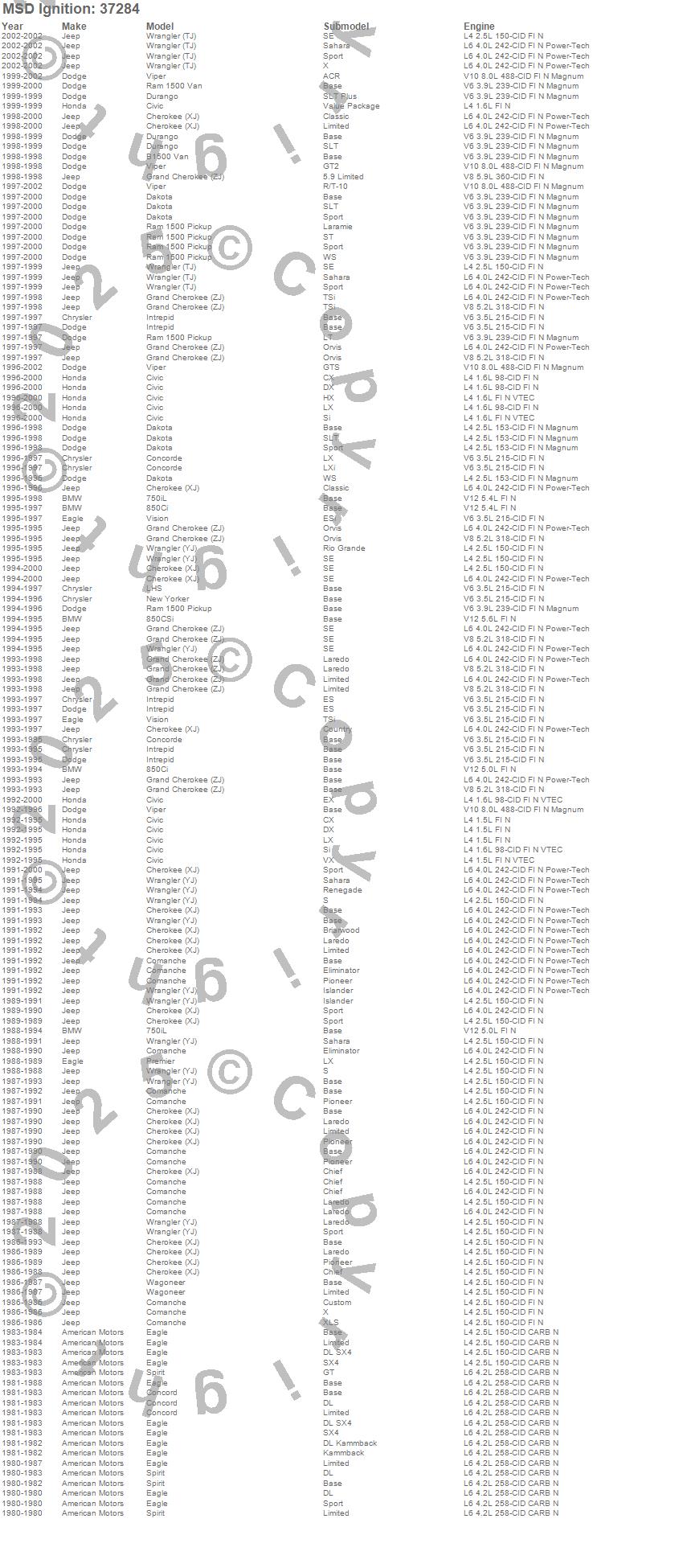750iL, 850Ci, 850CSi, B1500 Van, Cherokee (XJ), Civic, Comanche, Concord, Concorde, Dakota, Durango, Eagle, Grand Cherokee (ZJ), Intrepid, LHS, New Yorker, Premier, Ram 1500, Ram 1500 Van, Spirit