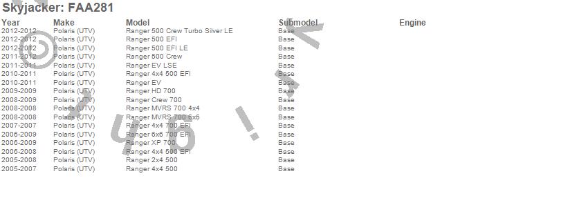 Ranger 2x4 500, Ranger 4x4 500, Ranger 4x4 500 EFI, Ranger 4x4 700 EFI, Ranger 500 Crew, Ranger 500 Crew Turbo Silver LE, Ranger 500 EFI, Ranger 500 EFI LE, Ranger 6x6 700 EFI, Ranger Crew 700, Ranger EV, Ranger EV LSE, Ranger HD 700, Ranger MVRS 700 4x4, Ranger MVRS 700 6x6, Ranger XP 700, Polaris (UTV), 2012, 2011, 2010