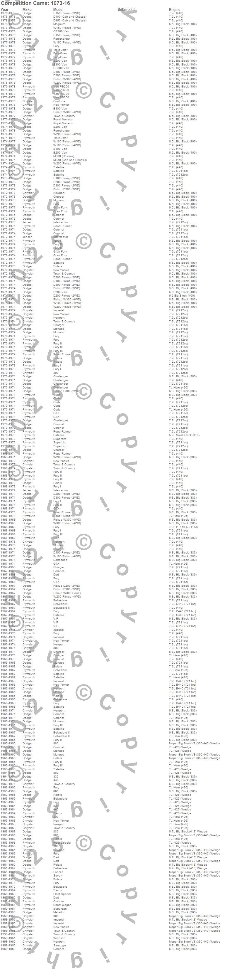 300, 330, 440, 880, B100 Van, B200 Van, B300 Van, Barracuda, Belvedere, Belvedere II, CB300 Van, Challenger, Charger, Cordoba, Coronet, Cuda, Custom, D100 Pickup, D150 Pickup, D200 Pickup