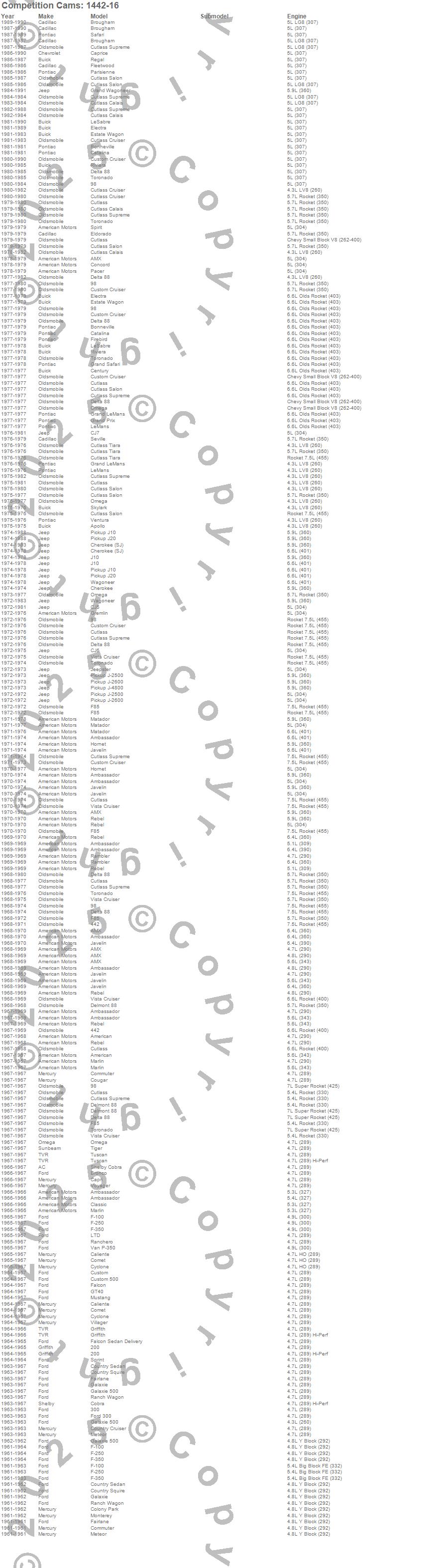 200, 442, 98, Ambassador, American, AMX, Apollo, Bonneville, Bronco, Brougham, Caliente, Capri, Caprice, Catalina, Century, Cherokee (SJ), CJ5, CJ6, CJ7, Classic