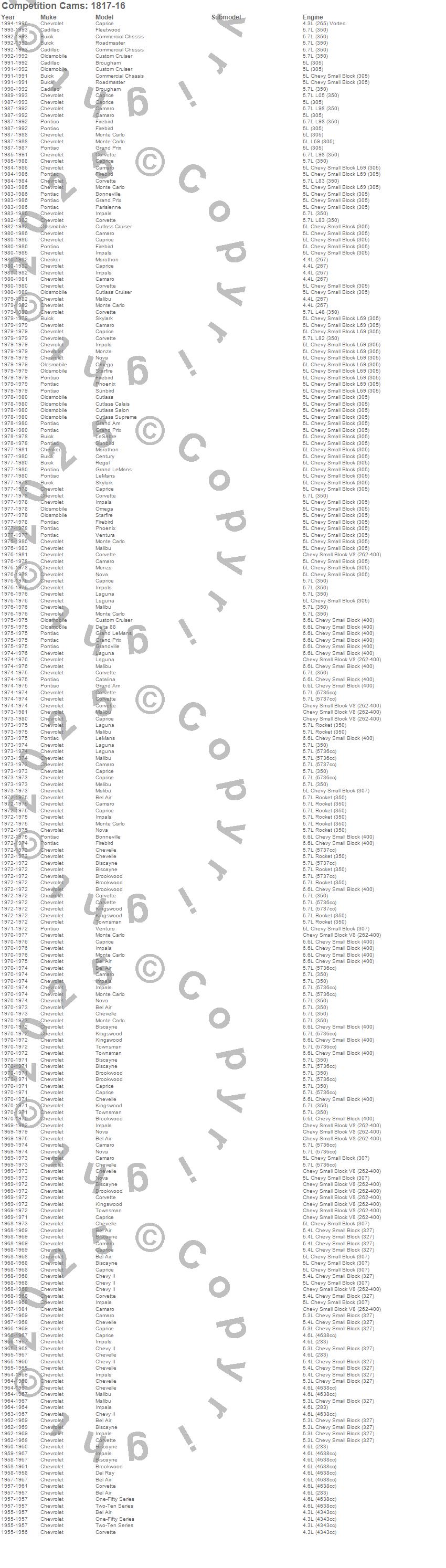 Bel Air, Biscayne, Bonneville, Brookwood, Brougham, Camaro, Caprice, Catalina, Century, Chevelle, Chevy II, Commercial Chassis, Corvette, Custom Cruiser, Cutlass, Cutlass Calais, Cutlass Cruiser, Cutlass Salon, Cutlass Supreme, Del Ray