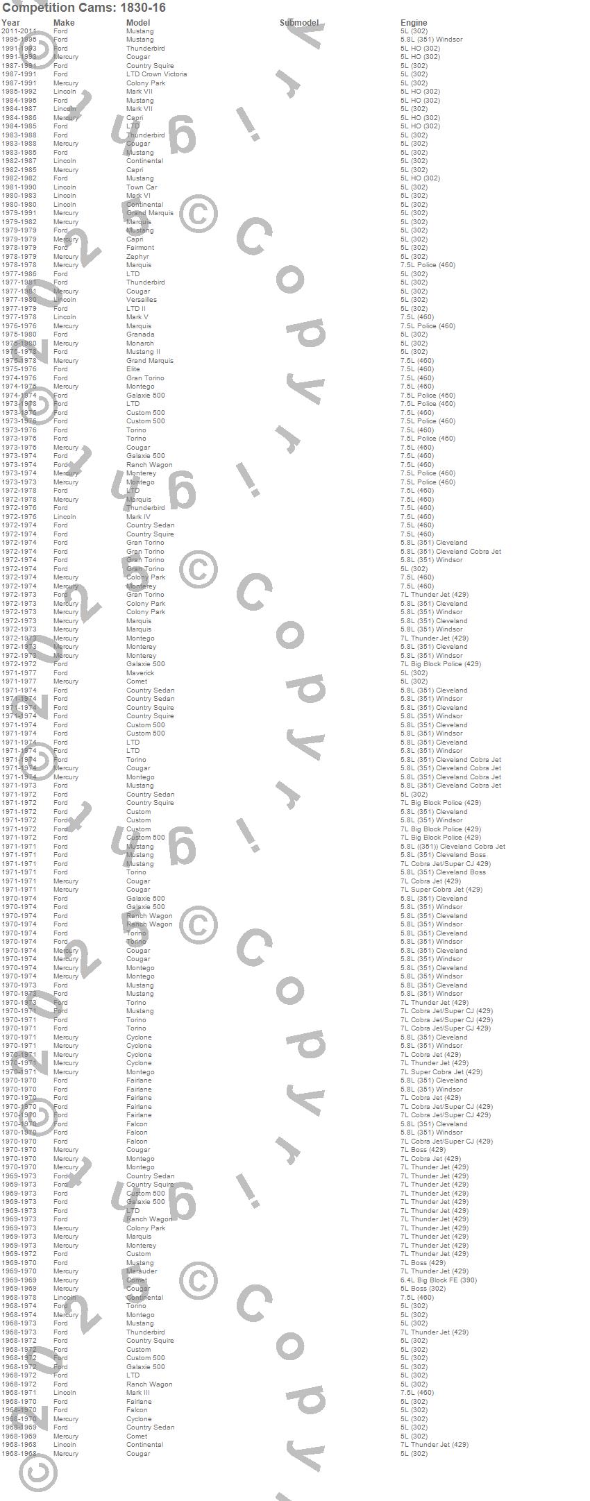 Capri, Colony Park, Comet, Continental, Cougar, Country Sedan, Country Squire, Custom, Custom 500, Cyclone, Elite, Fairlane, Fairmont, Falcon, Galaxie 500, Gran Torino, Granada, Grand Marquis, LTD, LTD Crown Victoria