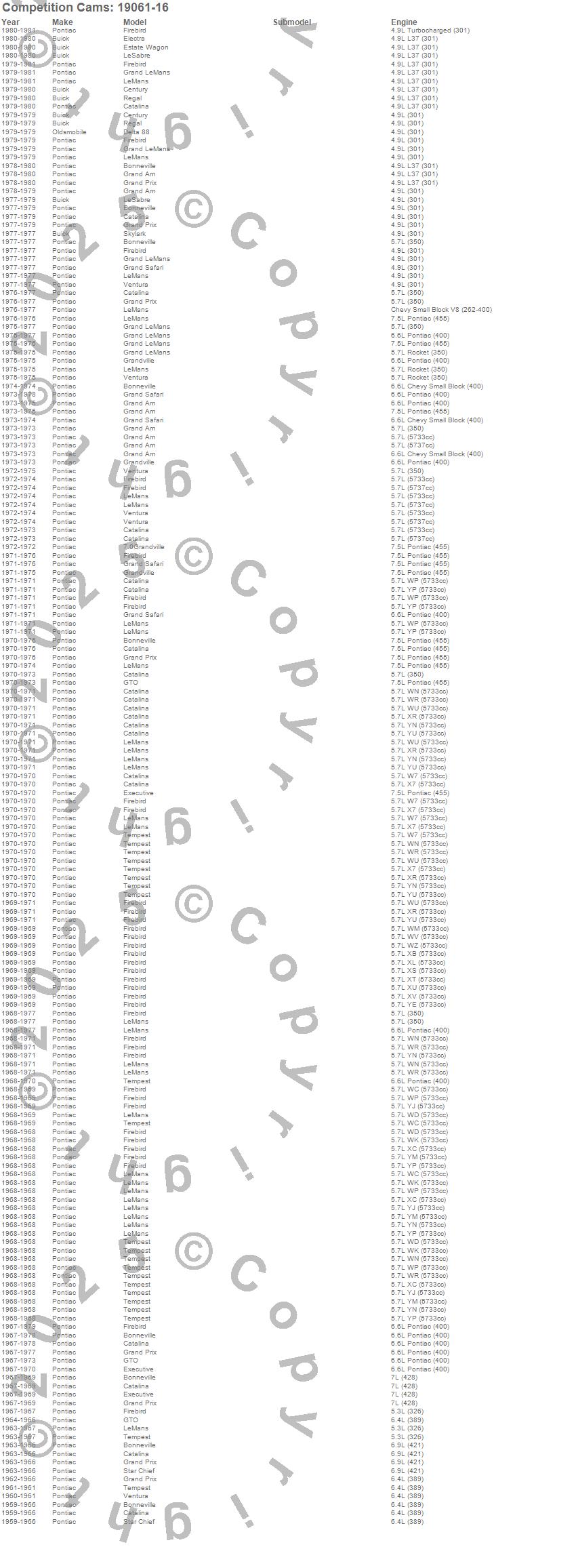 Bonneville, Catalina, Catalina Ventura, Century, Delta 88, Electra, Estate Wagon, Executive, Firebird, Firebird Trans Am, Grand Am, Grand LeMans, Grand Prix, Grand Safari, Grandville, GTO, LeMans, LeSabre, Regal, Safari