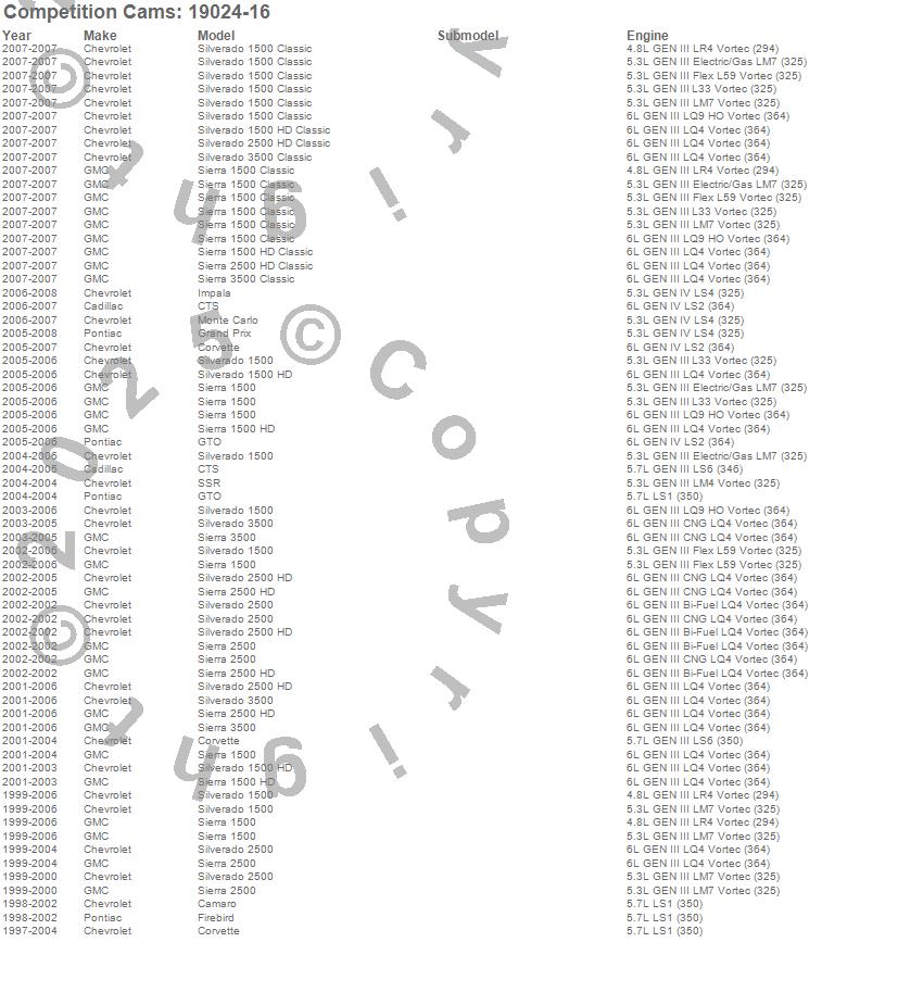 Camaro, Corvette, CTS, Firebird, Grand Prix, GTO, Impala, Monte Carlo, Sierra 1500, Sierra 1500 Classic, Sierra 1500 HD, Sierra 1500 HD Classic, Sierra 2500, Sierra 2500 HD, Sierra 2500 HD Classic, Sierra 3500, Sierra 3500 Classic, Silverado 1500, Silverado 1500 Classic, Silverado 1500 HD