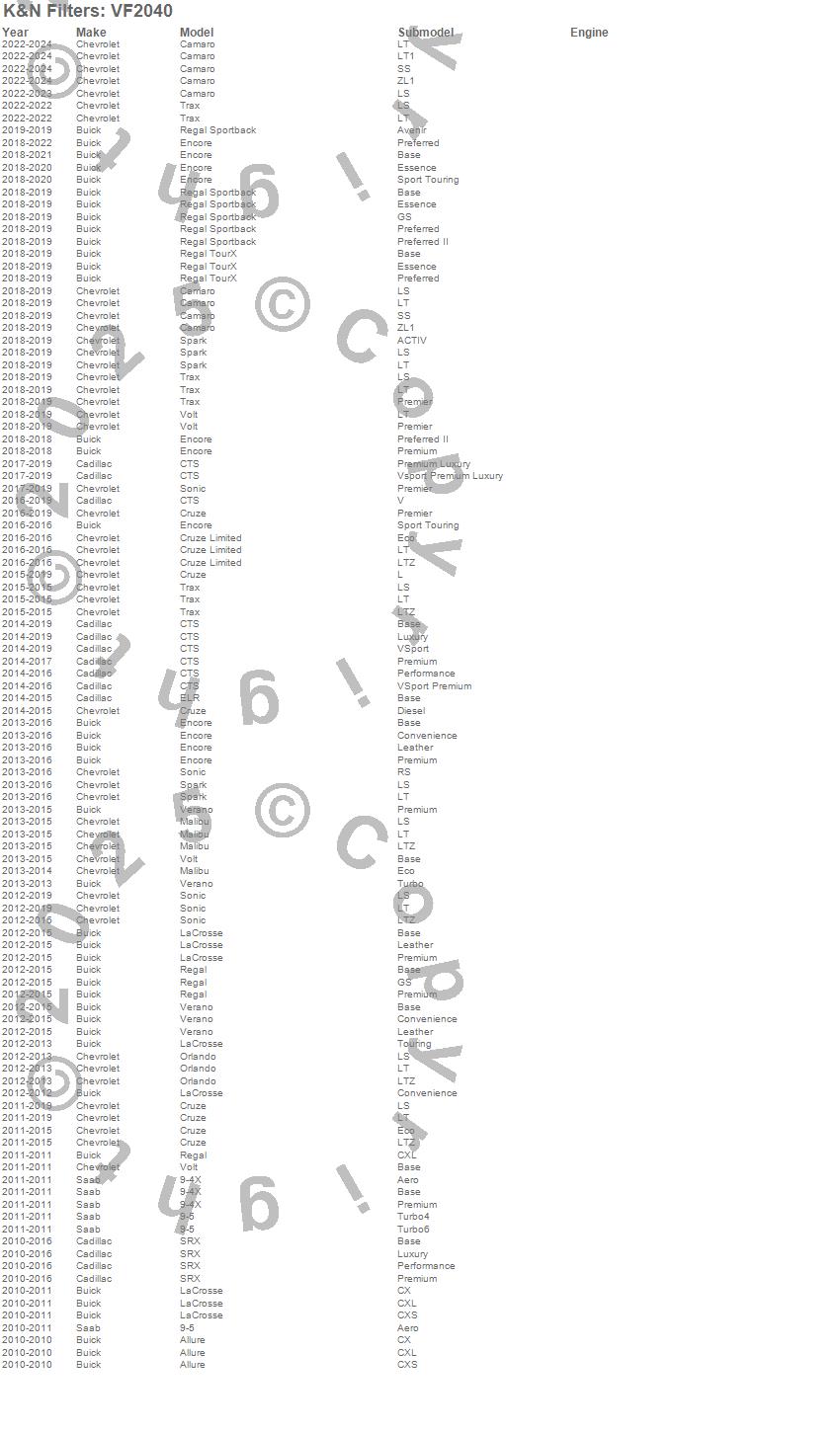 Below is an abbreviated list of applications for the Cabin Air Filter.