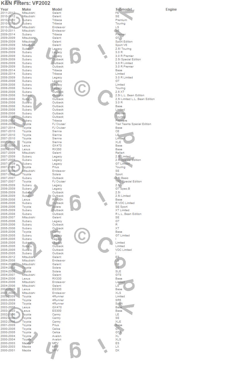 4Runner, Avalon, Camry, Celica, Endeavor, ES300, ES330, FJ Cruiser, Galant, GX470, Legacy, MPV, Outback, Prius, RX330, RX350, RX400h, Sienna, Solara, Tribeca