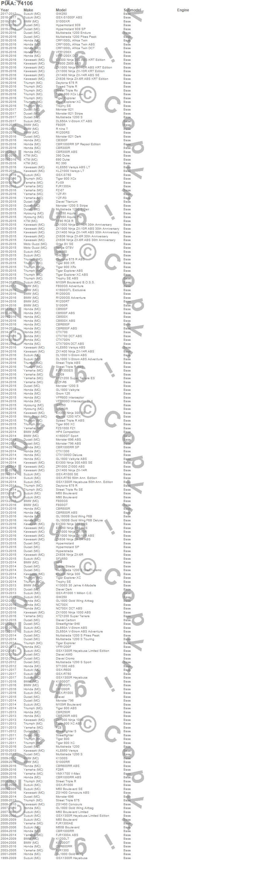 1190 RC8 R, 390 Duke, 690 Duke, CB1000R, CB300F, CB500F, CB500F ABS, CB500X, CB500X ABS, CBR1000RR, CBR1000RR ABS, CBR1000RR SP, CBR1000RR SP Repsol Edition, CBR250R, CBR250R ABS, CBR300R, CBR300R ABS, CBR500R, CBR500R ABS, CBR600RR