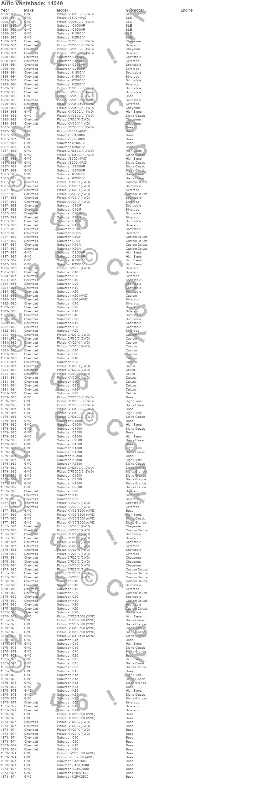 C10 Suburban, C15 Suburban, C15/C1500 Suburban, C1500 Suburban, C20 Pickup, C20 Suburban, C25 Suburban, C25/C2500 Pickup, C25/C2500 Suburban, C2500 Pickup, C2500 Suburban, C30 Pickup, C35/C3500 Pickup, C3500 Pickup, K10 Suburban, K15 Suburban, K15/K1500 Suburban, K1500 Suburban, K20 Pickup, K20 Suburban