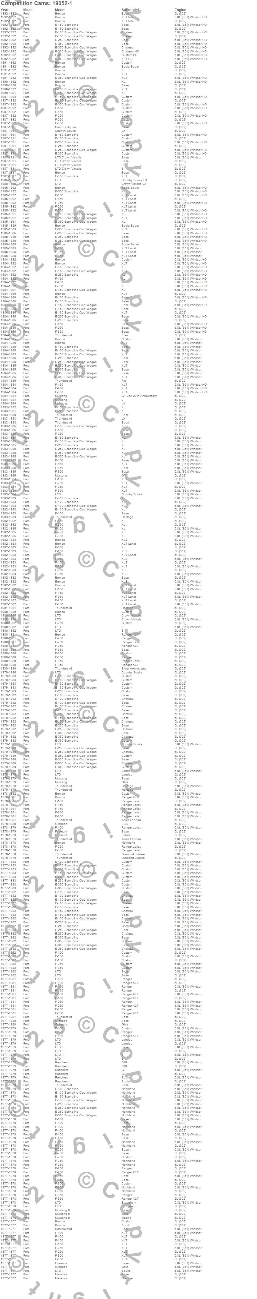 Bronco, Country Squire, Custom 500, E-100 Econoline, E-100 Econoline Club Wagon, E-150 Econoline, E-150 Econoline Club Wagon, E-250 Econoline, E-250 Econoline Club Wagon, E-350 Econoline, E-350 Econoline Club Wagon, F-100, F-150, F-250, F-350, Fairmont, Granada, LTD, LTD Crown Victoria, LTD II