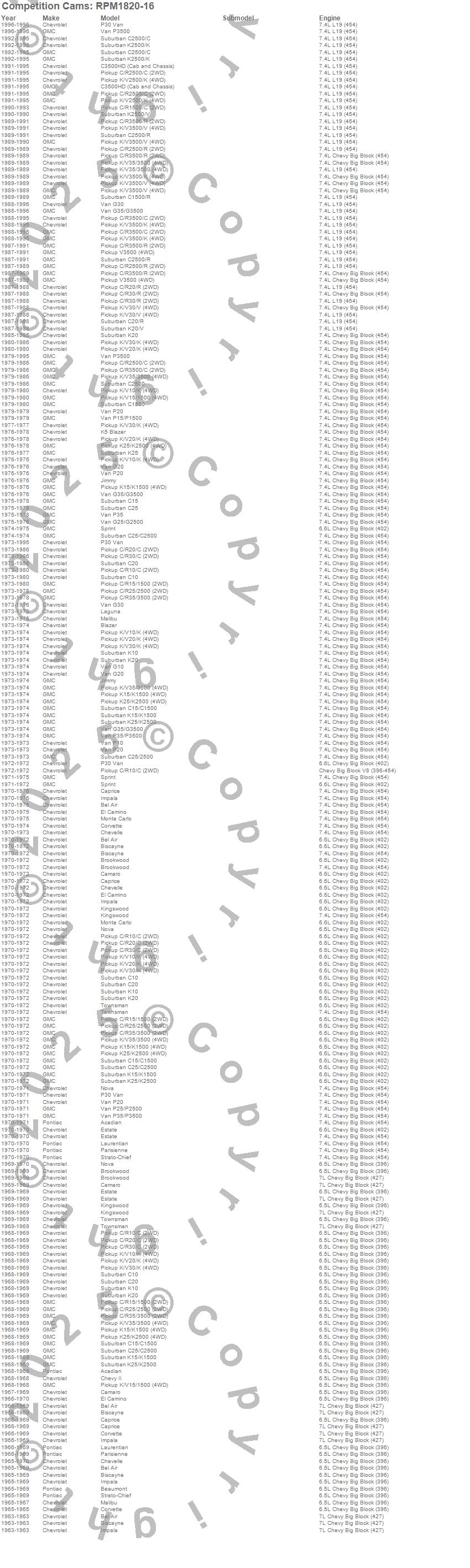 Acadian, Beaumont, Bel Air, Biscayne, Blazer, Blazer K5, Brookwood, C10 Pickup, C10 Suburban, C15 Suburban, C15/C1500 Suburban, C1500 Pickup, C1500 Suburban, C20 Pickup, C20 Suburban, C25 Suburban, C25/C2500 Pickup, C25/C2500 Suburban, C2500 Pickup, C2500 Suburban
