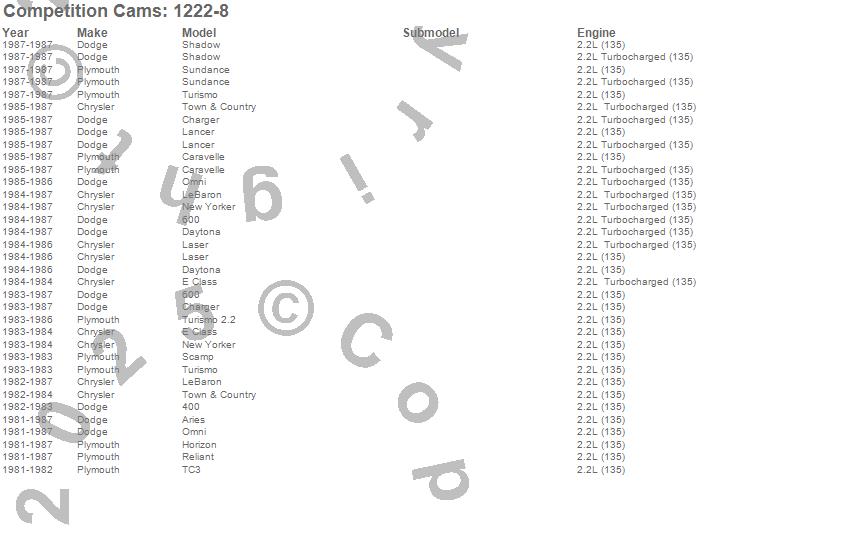 400, 600, Aries, Caravelle, Charger, Daytona, E Class, Executive Limousine, Horizon, Lancer, Laser, LeBaron, New Yorker, Omni, Reliant, Scamp, Shadow, Sundance, TC3, Town & Country