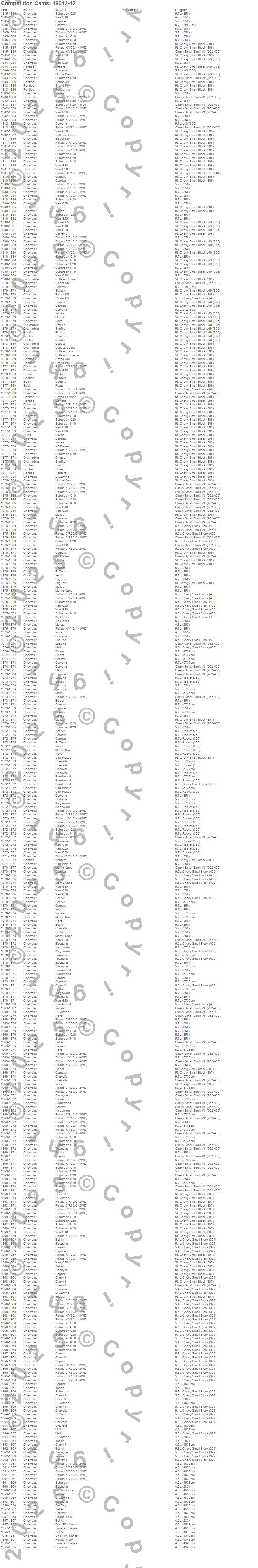 Bel Air, Biscayne, Blazer, Blazer K5, Bonneville, Brookwood, C10 Pickup, C10 Suburban, C20 Pickup, C20 Suburban, C30 Pickup, Camaro, Caprice, Century, Chevelle, Chevy II, Corvette, Cutlass, Cutlass Calais, Cutlass Cruiser