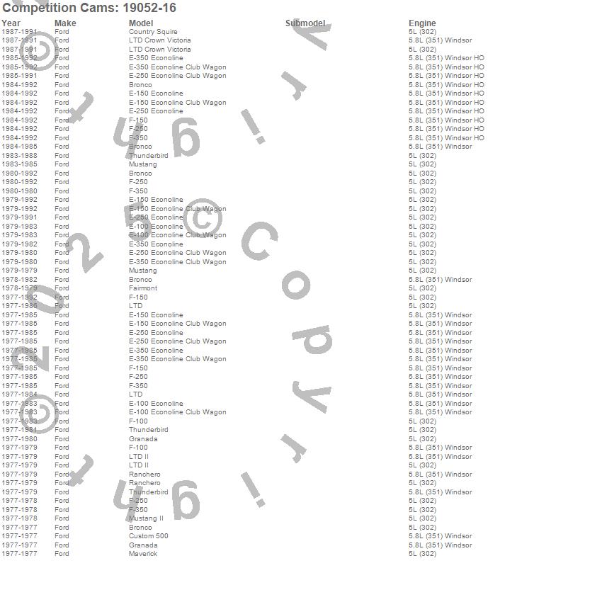 Bronco, Country Squire, Custom 500, E-100 Econoline, E-100 Econoline Club Wagon, E-150 Econoline, E-150 Econoline Club Wagon, E-250 Econoline, E-250 Econoline Club Wagon, E-350 Econoline, E-350 Econoline Club Wagon, F-100, F-150, F-250, F-350, Fairmont, Granada, LTD, LTD Crown Victoria, LTD II