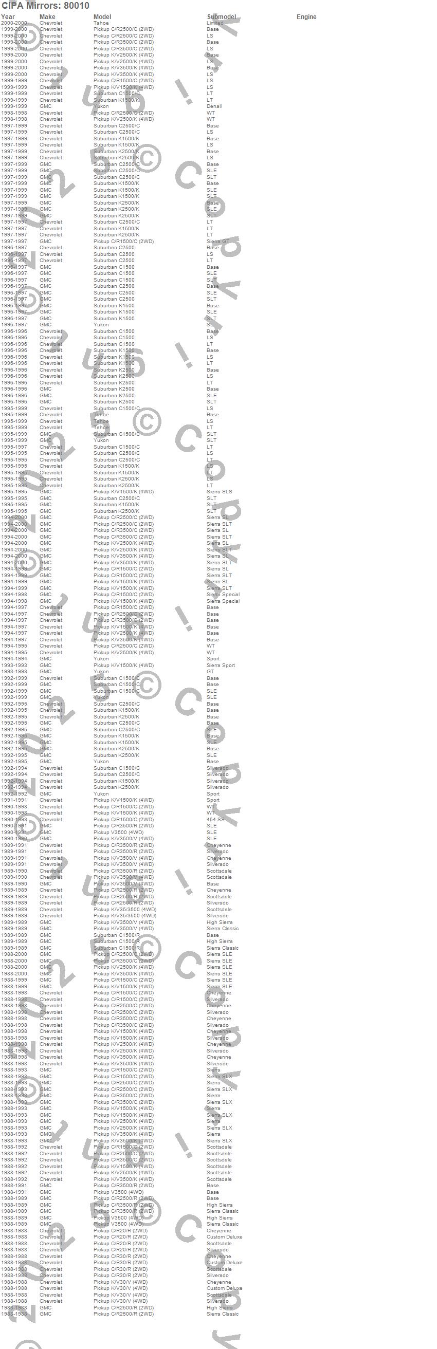 C1500 Pickup, C1500 Suburban, C2500 Pickup, C2500 Suburban, C3500 Pickup, K1500, K1500 Pickup, K1500 Suburban, K2500 Pickup, K2500 Suburban, K3500 Pickup, R20 Pickup, R2500 Pickup, R30 Pickup, R3500 Pickup, Tahoe, V30 Pickup, V3500 Pickup, Yukon, Chevrolet