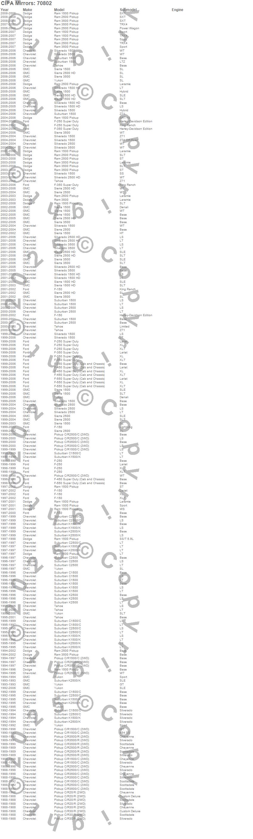 C1500 Pickup, C1500 Suburban, C2500 Pickup, C2500 Suburban, C3500 Pickup, F-150, F-250, F-250 Super Duty, F-350 Super Duty, F-450 Super Duty, F-550 Super Duty, K1500 Suburban, K2500 Suburban, R20 Pickup, R2500 Pickup, R30 Pickup, R3500 Pickup, Ram 1500, Ram 2500, Ram 3500