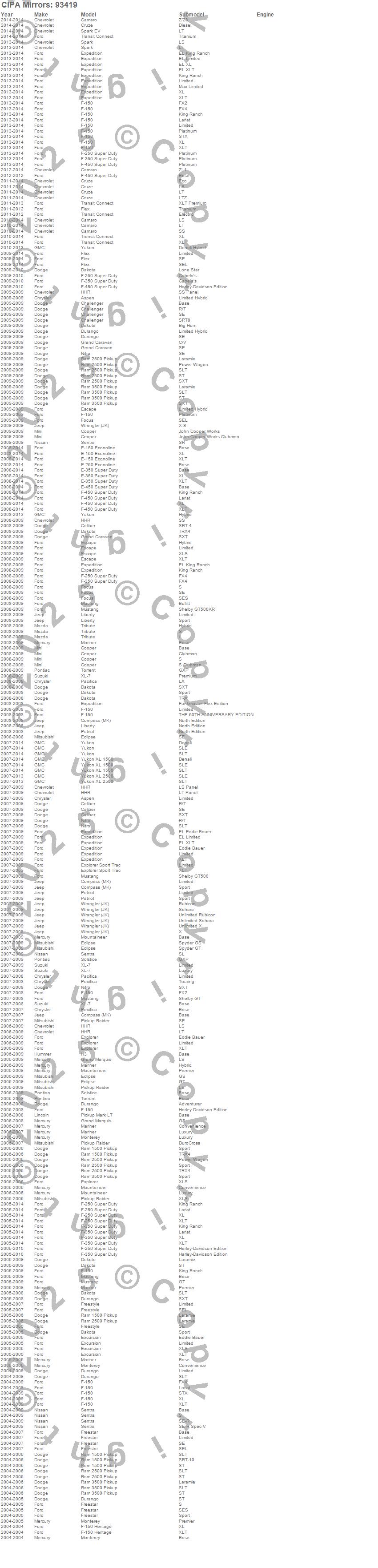 Aspen, Caliber, Camaro, Challenger, Compass, Cooper, Cruze, Dakota, Durango, E-150 Econoline, E-250 Econoline, E-350 Super Duty, E-450 Super Duty, Eclipse, Escape, Excursion, Expedition, Explorer, Explorer Sport Trac, F-150
