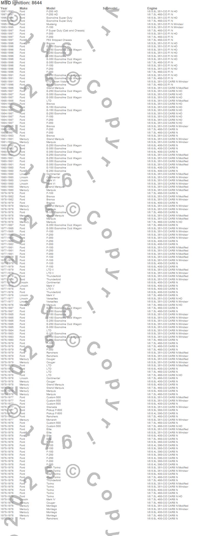 Bronco, Continental, Cougar, Custom 500, E-100 Econoline, E-100 Econoline Club Wagon, E-150 Econoline, E-150 Econoline Club Wagon, E-250 Econoline, E-250 Econoline Club Wagon, E-350 Econoline, E-350 Econoline Club Wagon, Econoline Super Duty, Elite, F Super Duty, F-100, F-150, F-250, F-250 HD, F-350
