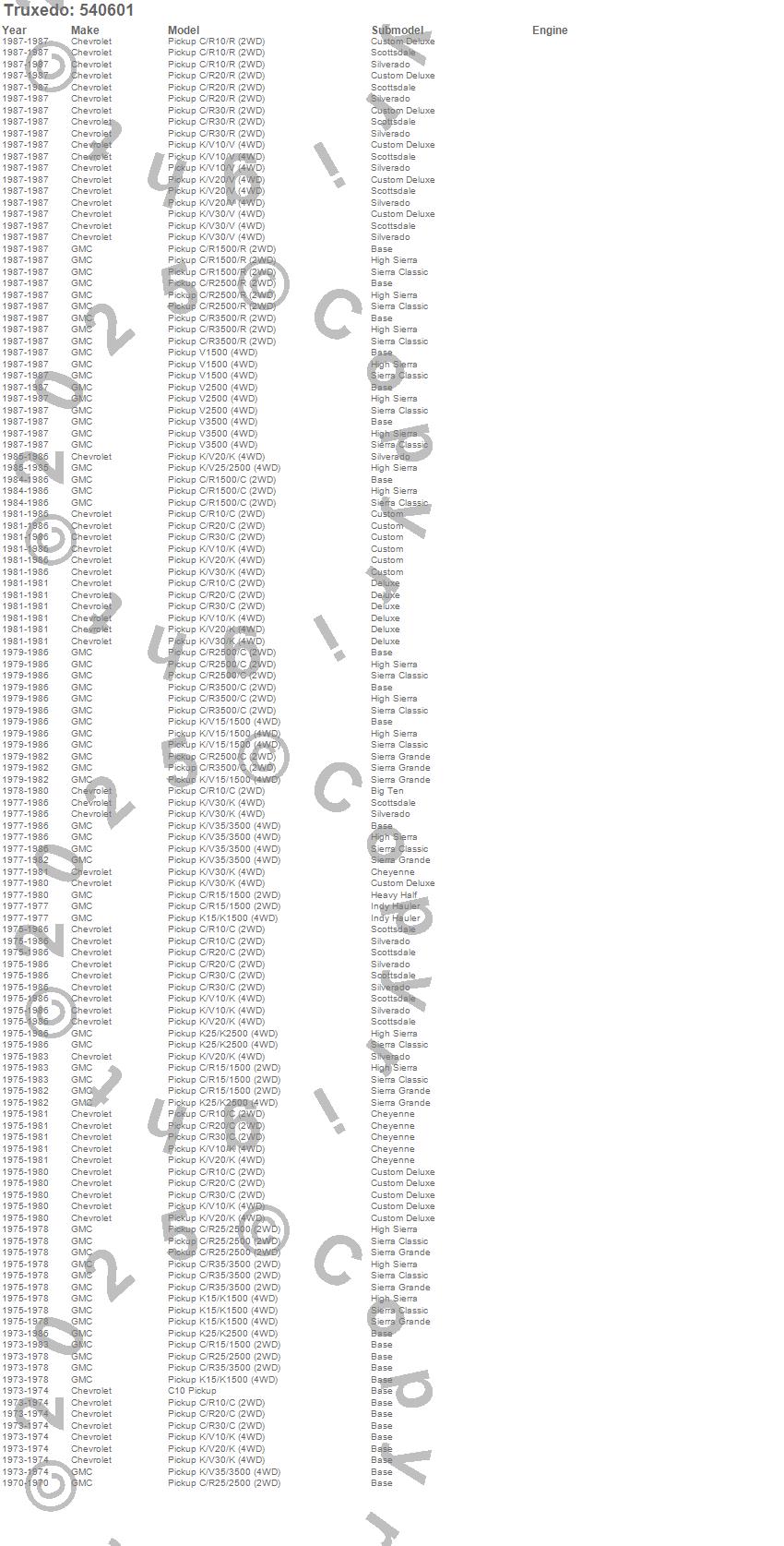 C10 Pickup, C1500 Pickup, C20 Pickup, C25/C2500 Pickup, C2500 Pickup, C30 Pickup, C35/C3500 Pickup, C3500 Pickup, K10 Pickup, K1500 Pickup, K20 Pickup, K25 Pickup, K25/K2500 Pickup, K2500 Pickup, K30 Pickup, K35 Pickup, K35/K3500 Pickup, K3500 Pickup, R10 Pickup, R1500 Pickup