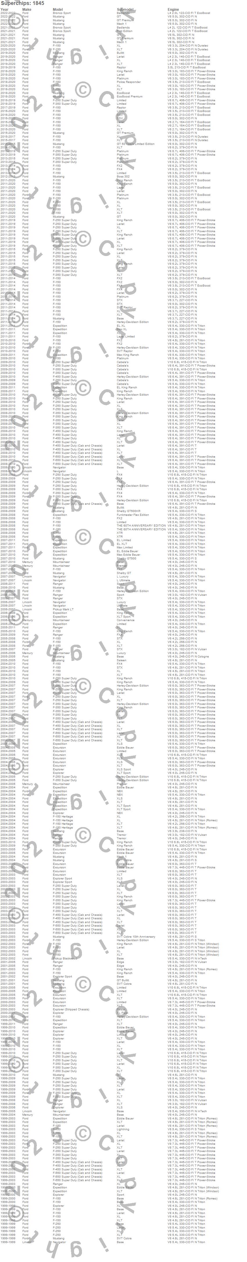 Blackwood, Bronco Sport, Excursion, Expedition, Explorer, Explorer (Stripped Chassis), Explorer Sport, F-150, F-150 Heritage, F-250, F-250 Super Duty, F-350 Super Duty, F-450 Super Duty, F-550 Super Duty, Mark LT, Mountaineer, Mustang, Navigator, Ranger, Ford