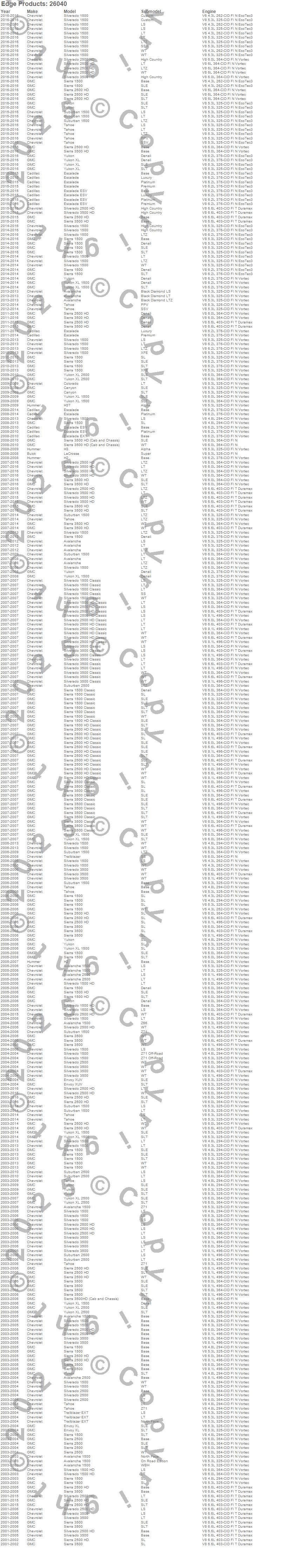 Avalanche, Avalanche 1500, Avalanche 2500, Canyon, Colorado, Envoy XL, Envoy XUV, Escalade, Escalade ESV, Escalade EXT, H2, H3, H3T, LaCrosse, Sierra 1500, Sierra 1500 Classic, Sierra 1500 HD, Sierra 1500 HD Classic, Sierra 2500, Sierra 2500 HD