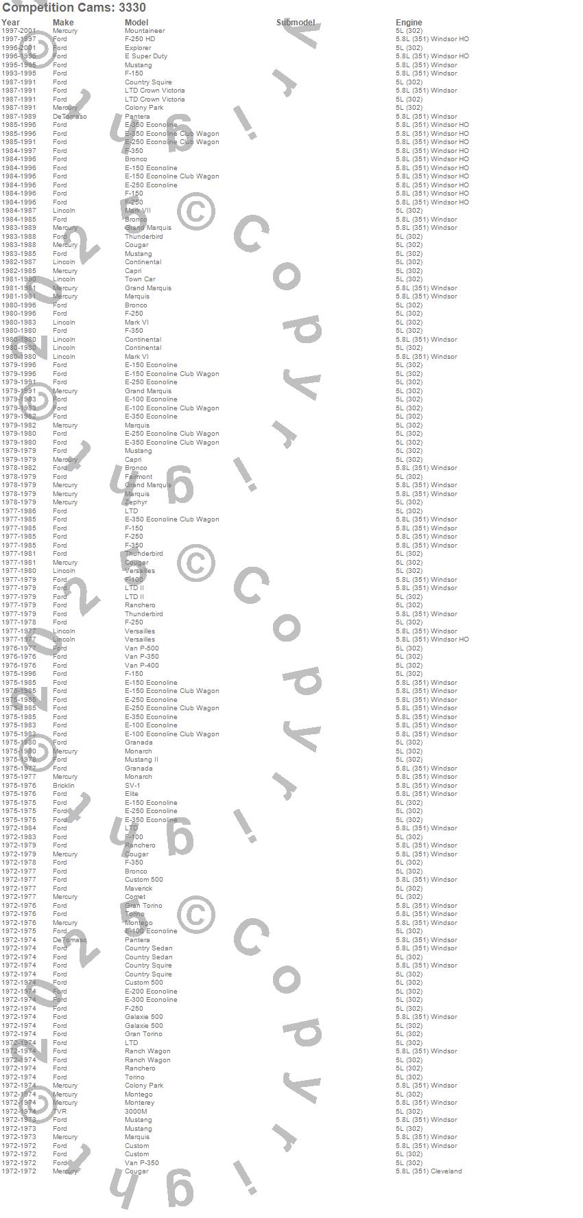 3000M, Bronco, Capri, Colony Park, Comet, Continental, Cougar, Country Sedan, Country Squire, Custom, Custom 500, E Super Duty, E-100 Econoline, E-100 Econoline Club Wagon, E-150 Econoline, E-150 Econoline Club Wagon, E-200 Econoline, E-250 Econoline, E-250 Econoline Club Wagon, E-300 Econoline