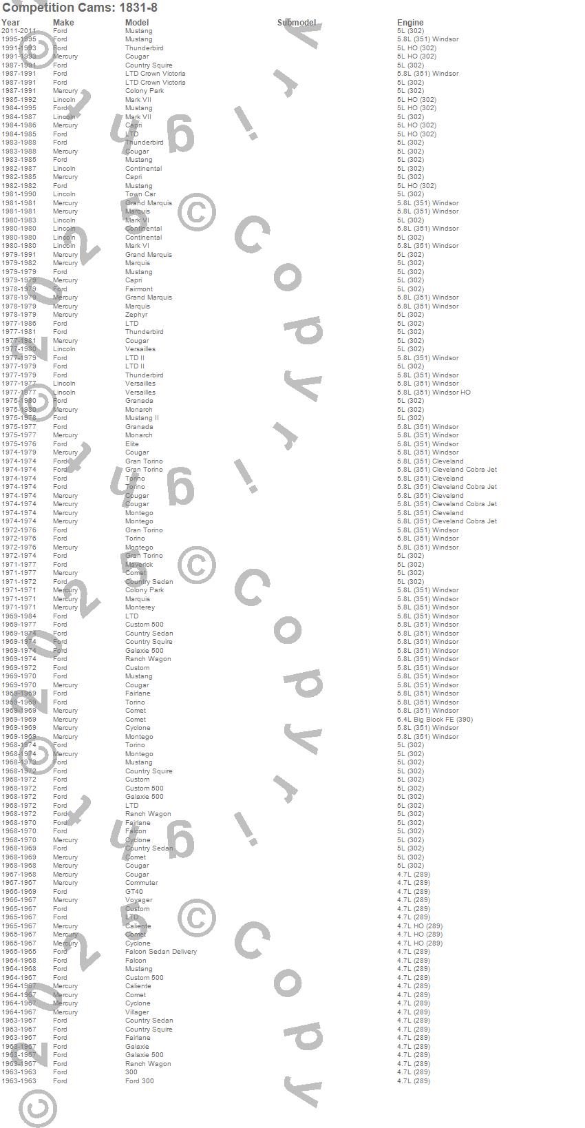 Caliente, Capri, Colony Park, Comet, Commuter, Continental, Cougar, Country Sedan, Country Squire, Custom, Custom 500, Cyclone, Elite, Fairlane, Fairmont, Falcon, Falcon Sedan Delivery, Ford 300, Galaxie, Galaxie 500